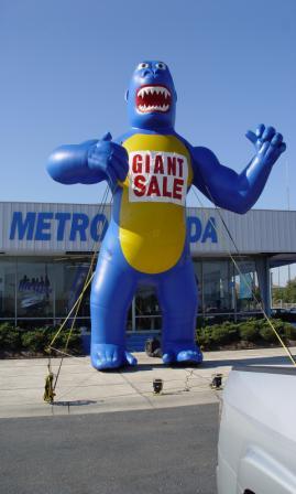 These Cold Air Balloons are GREAT FOR DRAWING INTEREST and customers. Balloons that are available are a 35ft. Frosty, a 30 ft. Black & Grey Gorilla, A 25ft. Space Shuttle, and a Giant 9 X 25 ft. Newspaper. All balloons can come with external lighting if power permits. Most balloons can have a banner to high light what you're trying to promote. SPECIAL NOTE: Frosty is looking for a home this winter. (Great RATE and doesn't eat much ! ! !)